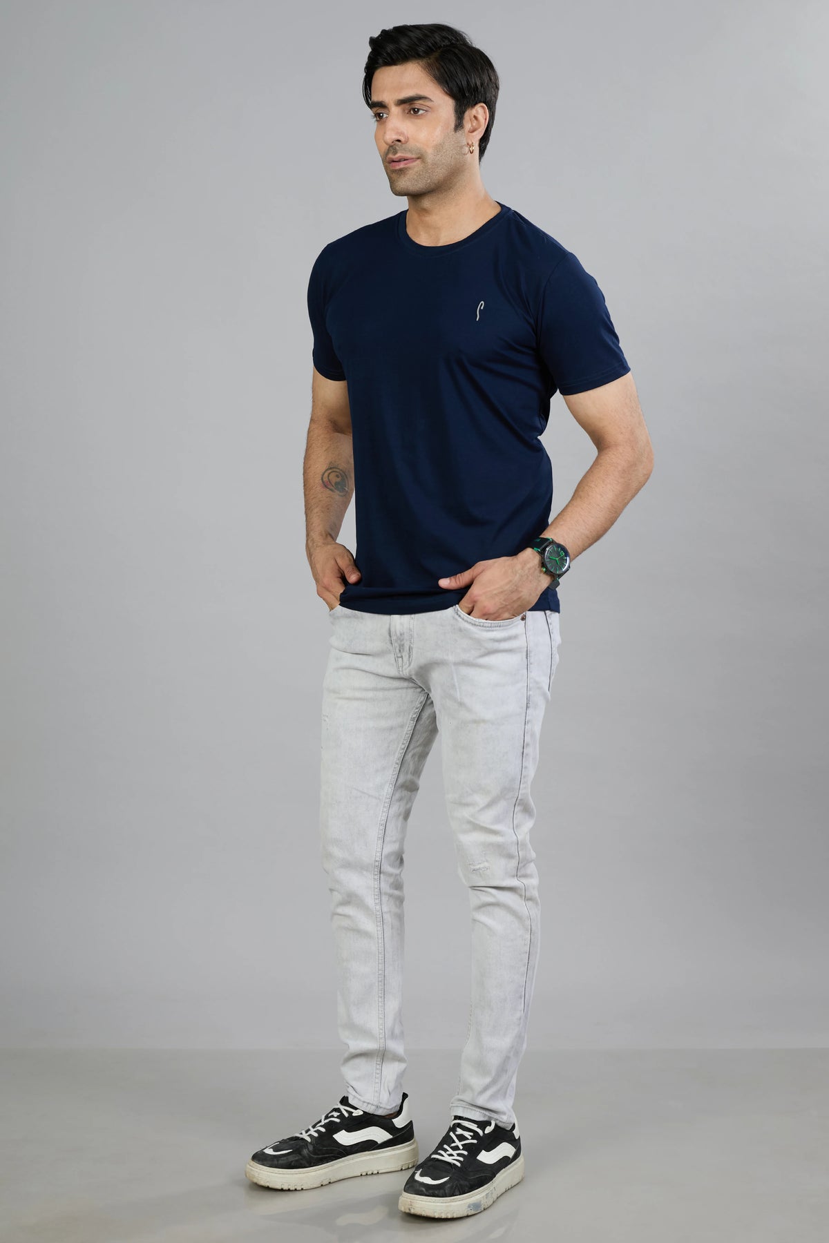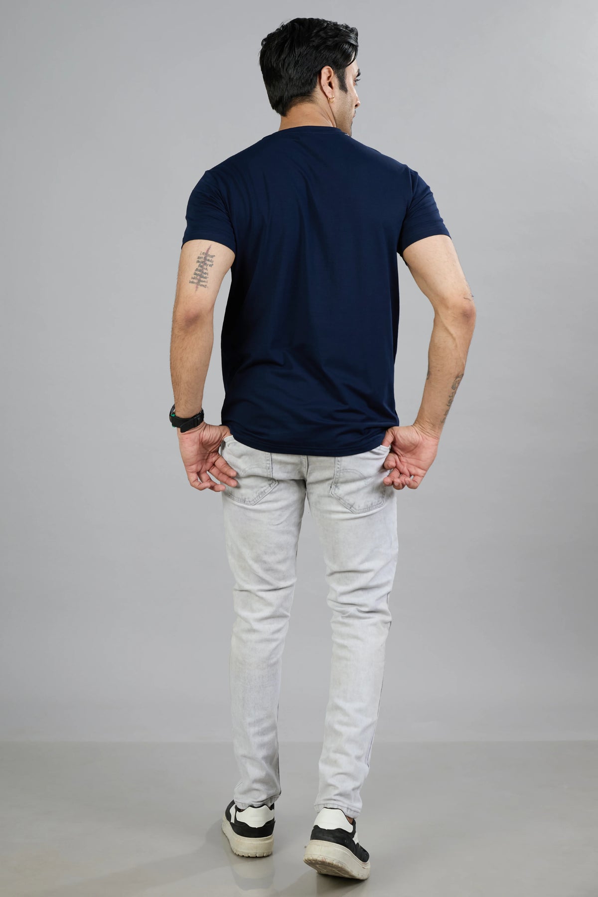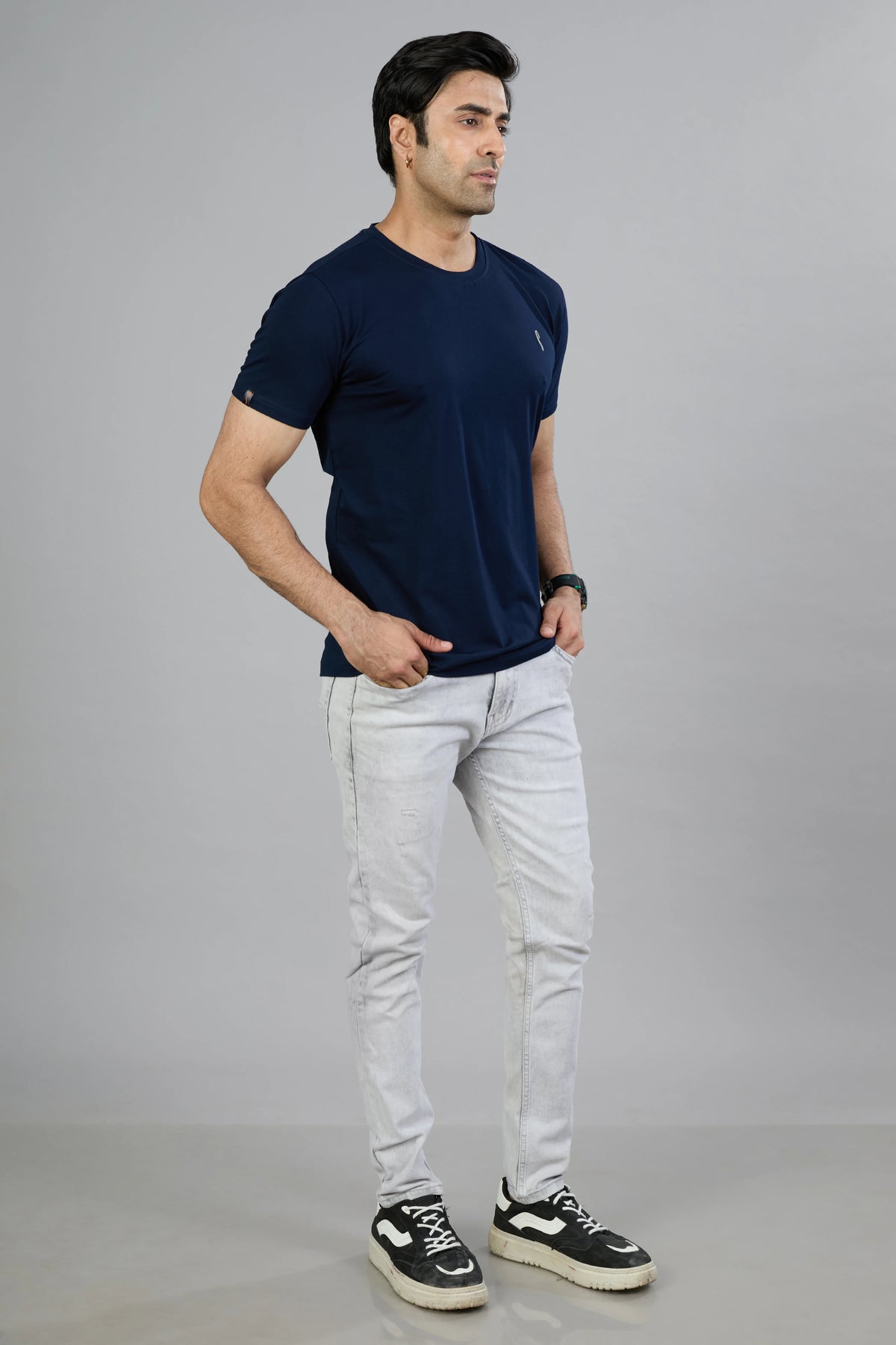 This Stride men's T-shirt features a dark navy cotton blend fabric designed for comfort and durability. Its half sleeves and classic crew neck offer a timeless fit, while the graphic print adds a distinctive style element. Ideal for casual wear, this T-shirt combines quality materials with contemporary design for everyday versatility.