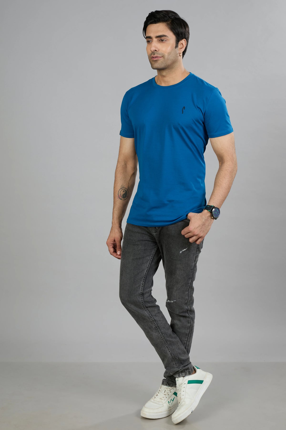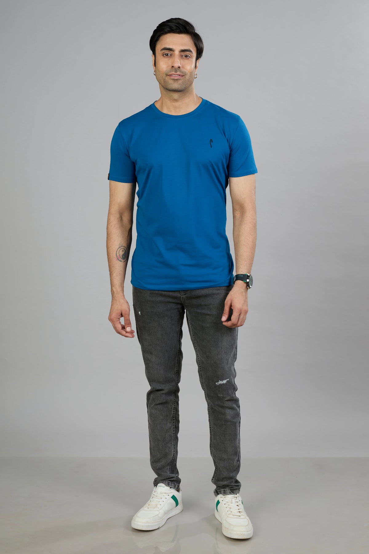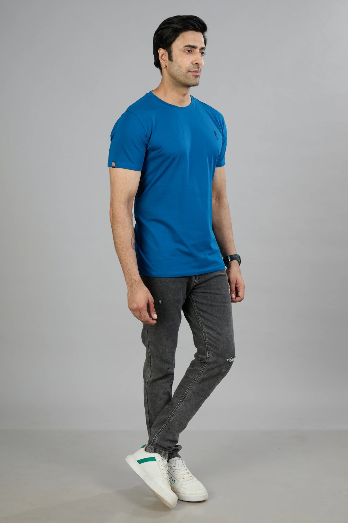 This Stride men's T-shirt features a dark navy cotton blend fabric designed for comfort and durability. Its half sleeves and classic crew neck offer a timeless fit, while the graphic print adds a distinctive style element. Ideal for casual wear, this T-shirt combines quality materials with contemporary design for everyday versatility.